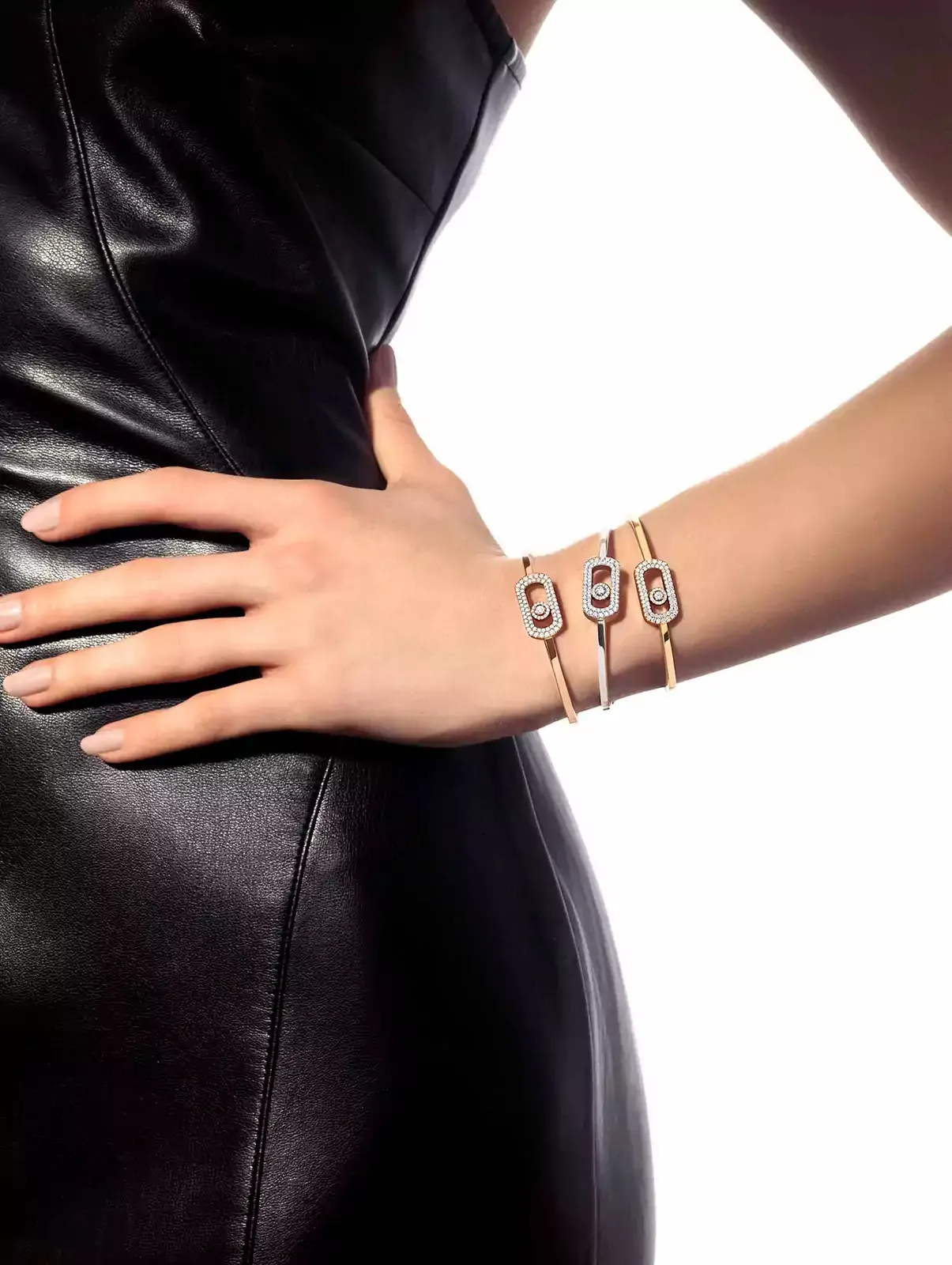 ゴールドの輝きとダイヤモンドの比類なき煌きの魅力を堪能するなら、異なるゴールドのブレスレットの重ねづけスタイルを。ダイヤモンドをあしらった精緻で繊細な《ムーヴ ウノ》パヴェ フレックス バングルのピンクゴールドは、イエローゴールドやホワイトゴールドの《ソー ムーヴ》バングルのムービングダイヤモンドと完璧に調和します。大胆にミックスを楽しみ、輝きましょう!