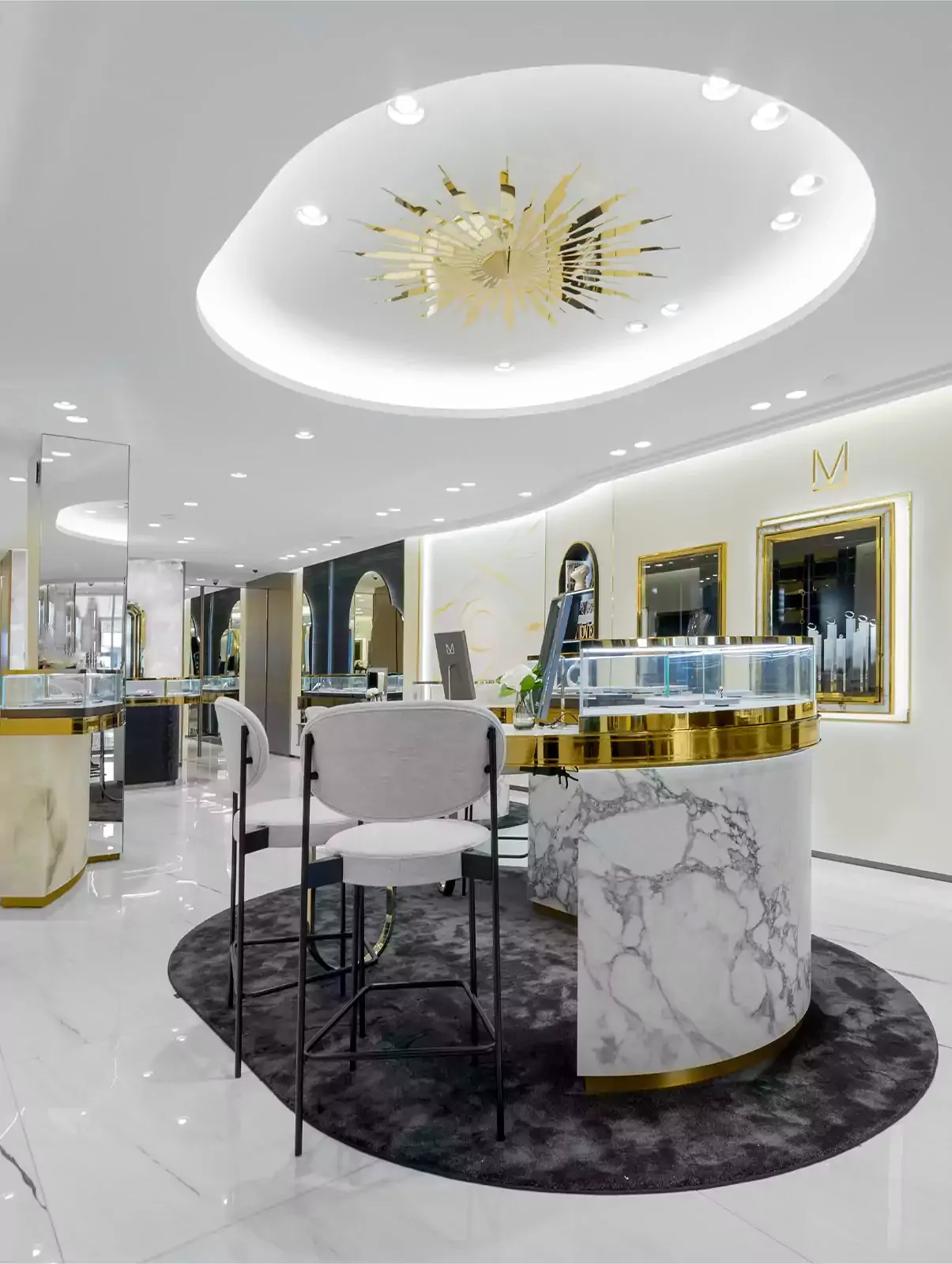 この他とは一線を画すブティック内で光を浴びるのが、人生の大切な瞬間を祝福する《(エ)モーション ドゥ メシカ》コレクションのソリテールリングとダイヤモンド ジュエリーです。さらに高級なモデルや最新の《ビヨンド ザ ライト》コレクションといったハイジュエリーも販売されます。