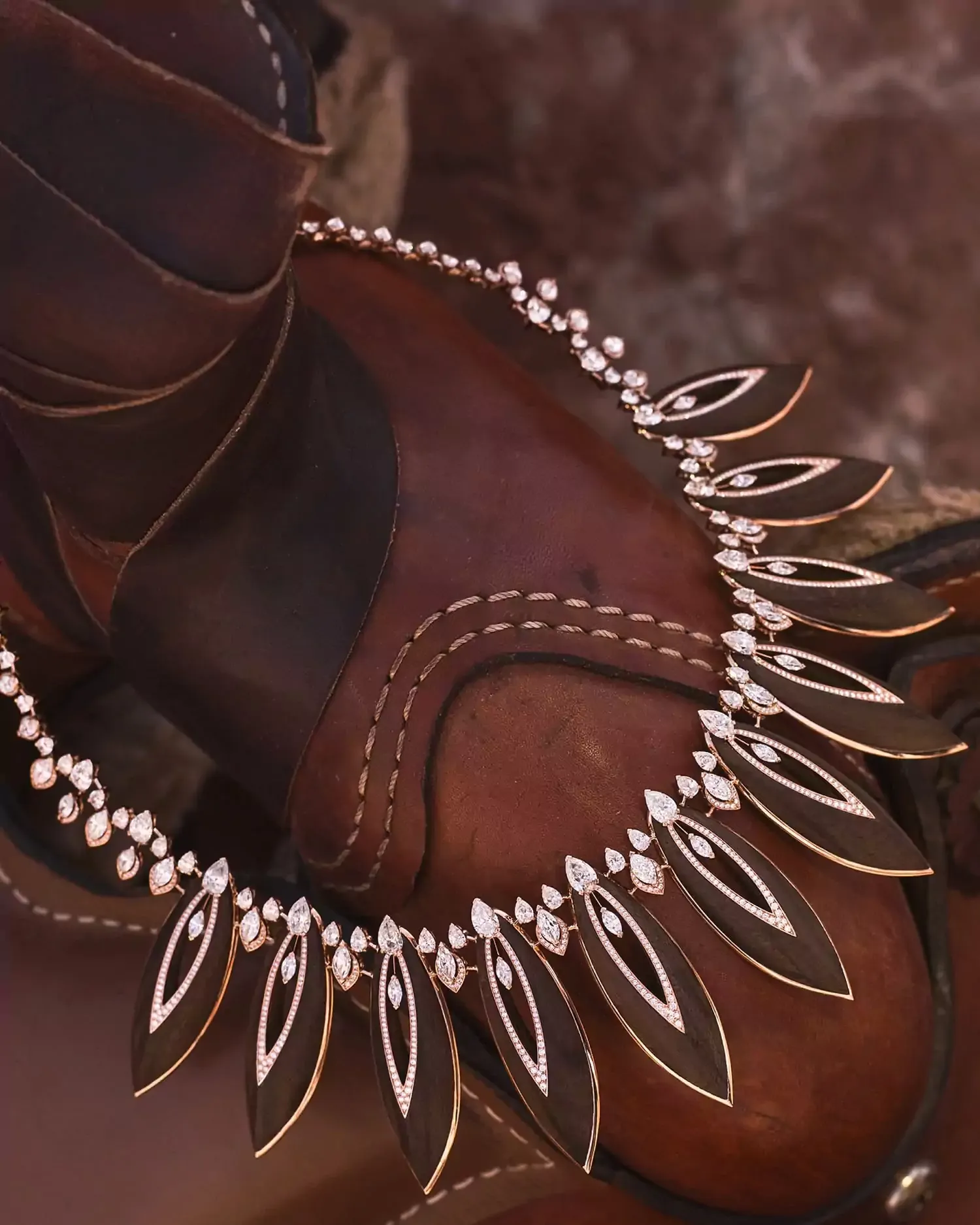 木材を用いたハイジュエリーのアイテムですね。革命とは言わないまでも、これはメゾンにとって本当の意味での進化です。たとえば、木材の先端をとがらせてカットすることで、ダイヤモンドジュエリーにボリューム感がプラスされました。こうしたすべてがひとつになって別の新たなリズムを生み、メシカのジュエリーに新しい活力をもたらします。