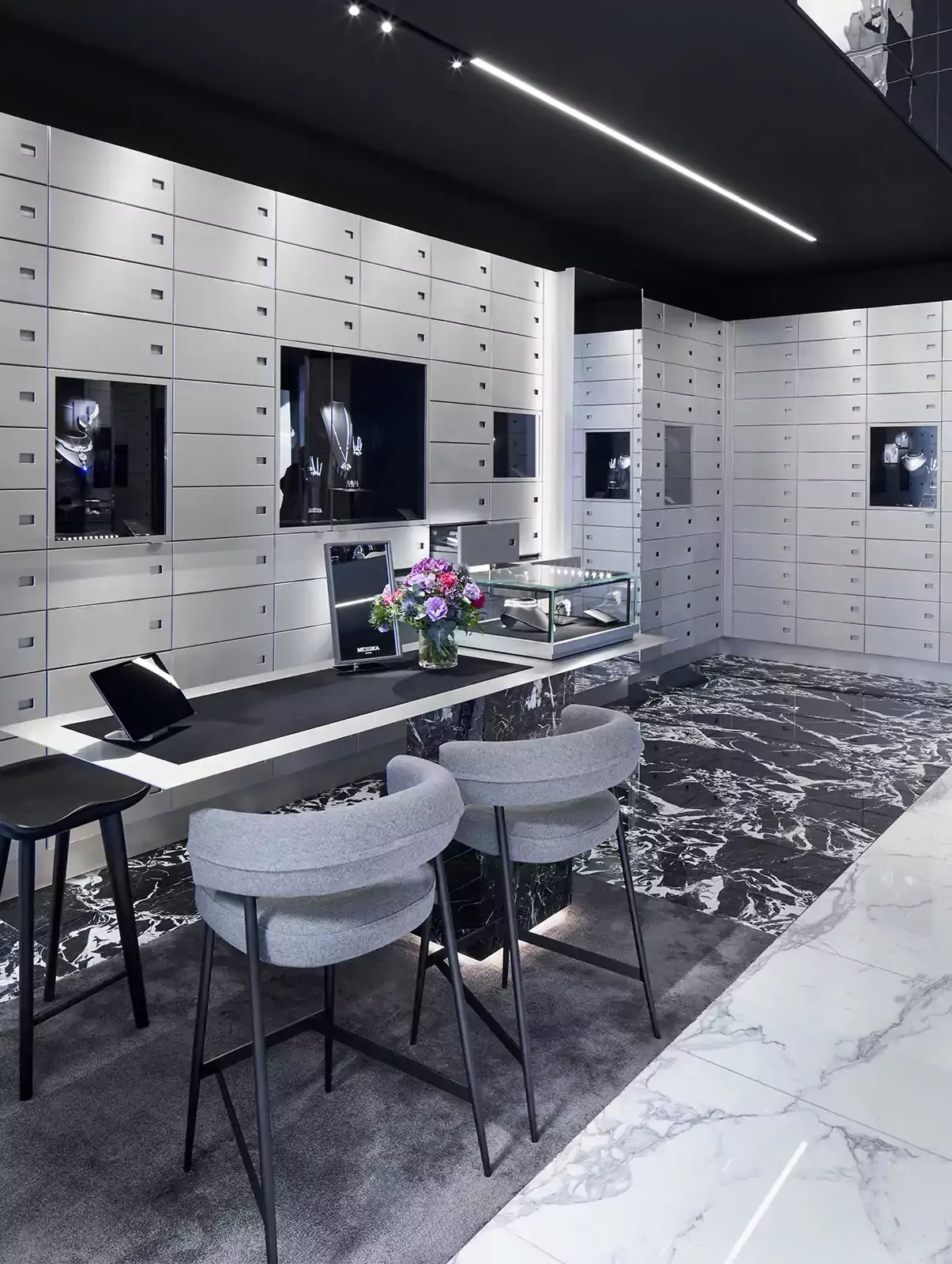 메시카가 패션과 비주얼 아이덴티티 분야에서 전문성을 인정받은 베탁(Betak)과 함께 방돔 광장의 전통과는 사뭇 다른 특별한 접근 방식을 선보였습니다. 발레리 메시카는 금고에서 영감을 받은 부티크를 구상했습니다.