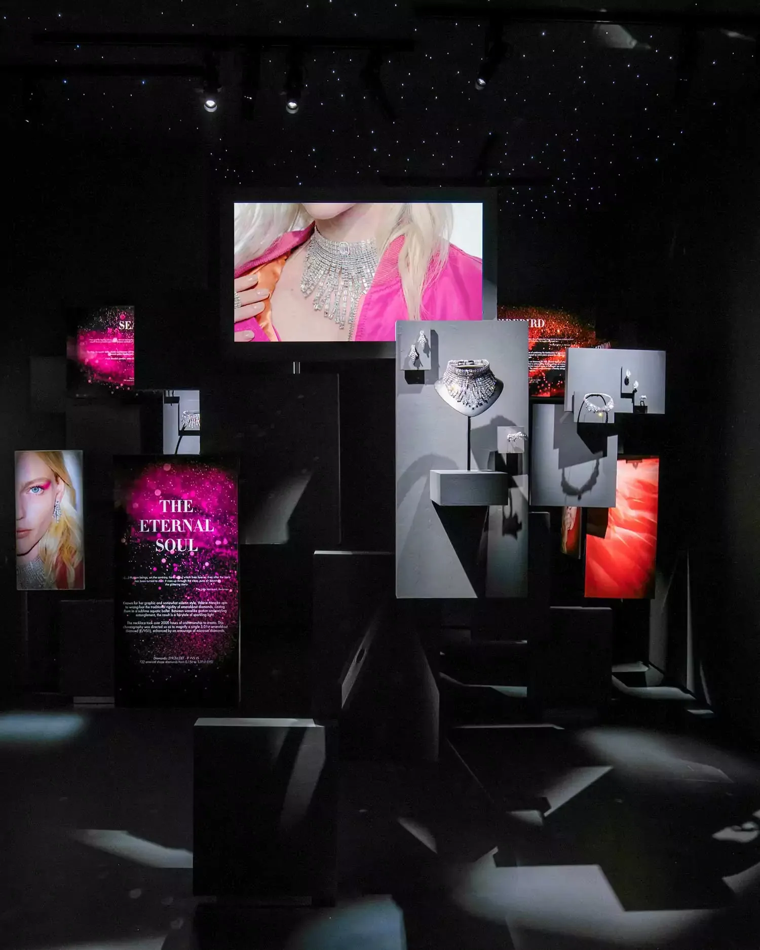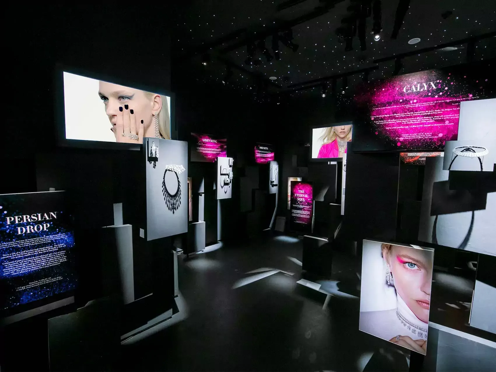 Украшения с бриллиантами, демонстрирующие высочайший уровень мастерства, были выставлены в зале Высокого ювелирного искусства, оформленного как шкатулка с драгоценностями. Сценография в стиле музейной экспозиции предлагала полюбоваться на украшения под усеянным звездами небом, напоминающим о сказках "Тысячи и одной ночи". Обстановка, фантасмагорический эффект которой усиливали оригинальное музыкальное сопровождение и темнота, прорезаемая лучами света, приглашала посетителей погрузиться в воображаемые миры, где все возможно. Сверкающие творения ювелирного искусства — серьги, колье, чокеры, каффы, кольца и браслеты — словно застыли в пространстве и времени.