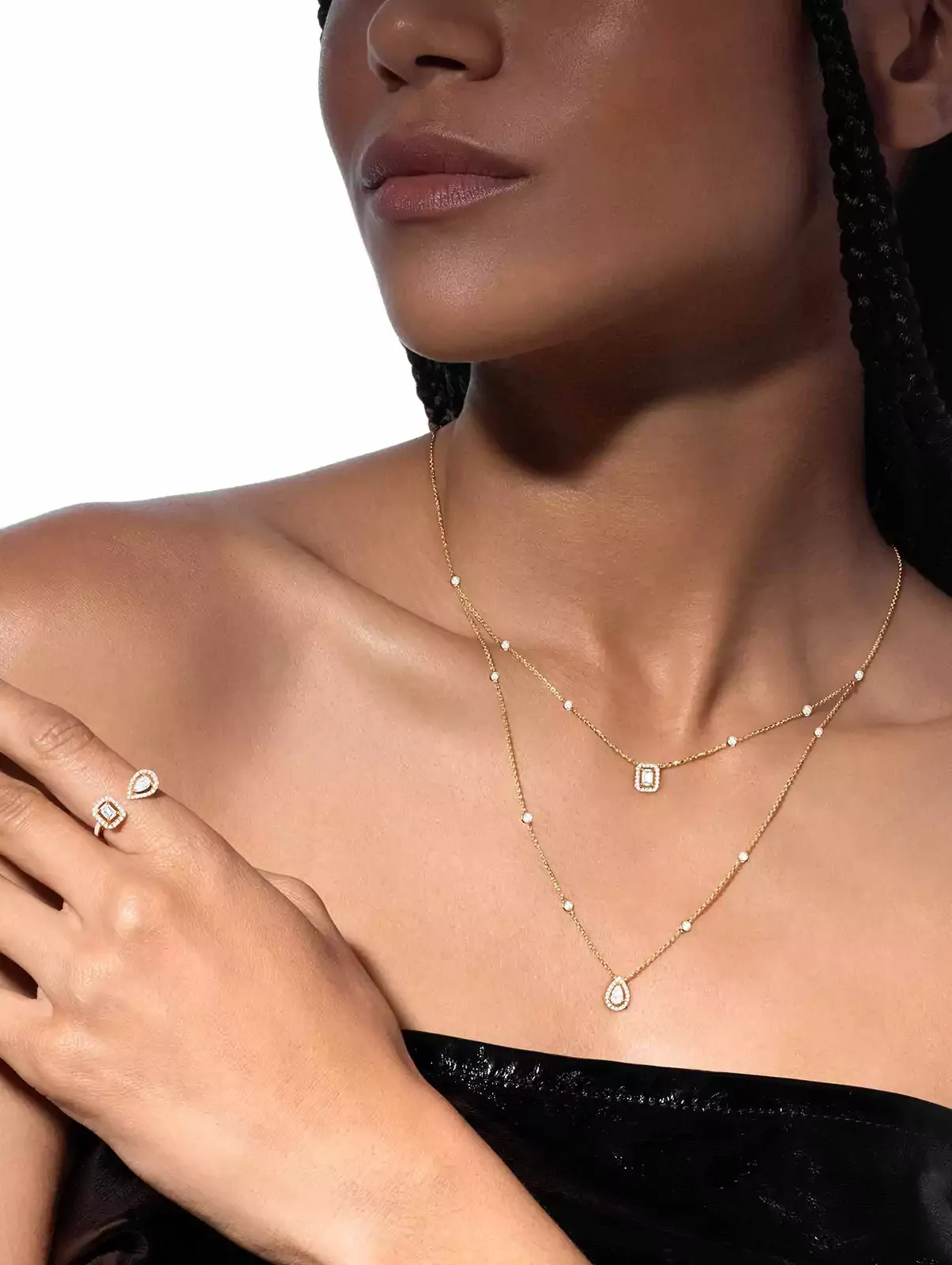 Изысканный сотуар или эффектный чокер, колье на цепочке или колье на шнурке – в коллекциях Messika каждая женщина сможет найти украшение, которое подойдет именно ей. Так, например, отличным выбором станет колье с бриллиантами Lucky Move регулируемой длины с завораживающим центральным мотивом. Не знаете, как сочетать украшения? Мы придумали для вас идеальное решение: колье в два ряда Move Uno из белого золота с бриллиантовым паве, в котором две золотые нити с подвесками безупречно гармонируют друг с другом. Также обратите внимание на колье в два ряда My Twin, где цепочки разной длины украшены бриллиантами двух видов огранки – грушевидной и изумрудной – для создания поистине блистательного образа.