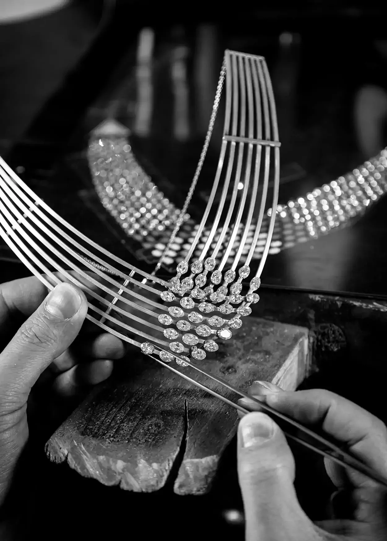 Украшение из коллекции Высокого ювелирного искусства — все равно что платье от-кутюр. Оно исполнено волшебным очарованием, которое заставляет забыть обо всем на свете. Мир Высокой моды всегда привлекал Валери Мессика. Воздушная легкость, прозрачность, эффект струящегося шелка и абсолютный комфорт... Только наиболее искусные мастера в силах справиться со столь сложной задачей, ведь речь идет о таких твердых материалах как золото и бриллианты. Ювелиры режут металл, придают ему форму, устанавливают камни. Наконец, украшение готово. В мастерской, где создают творения по индивидуальному заказу, всегда витает ощущение чуда.