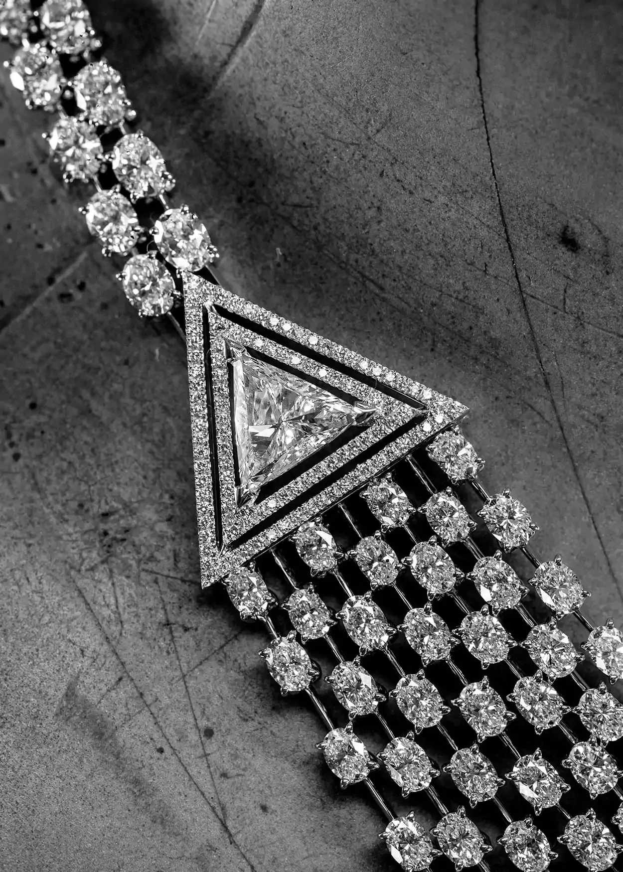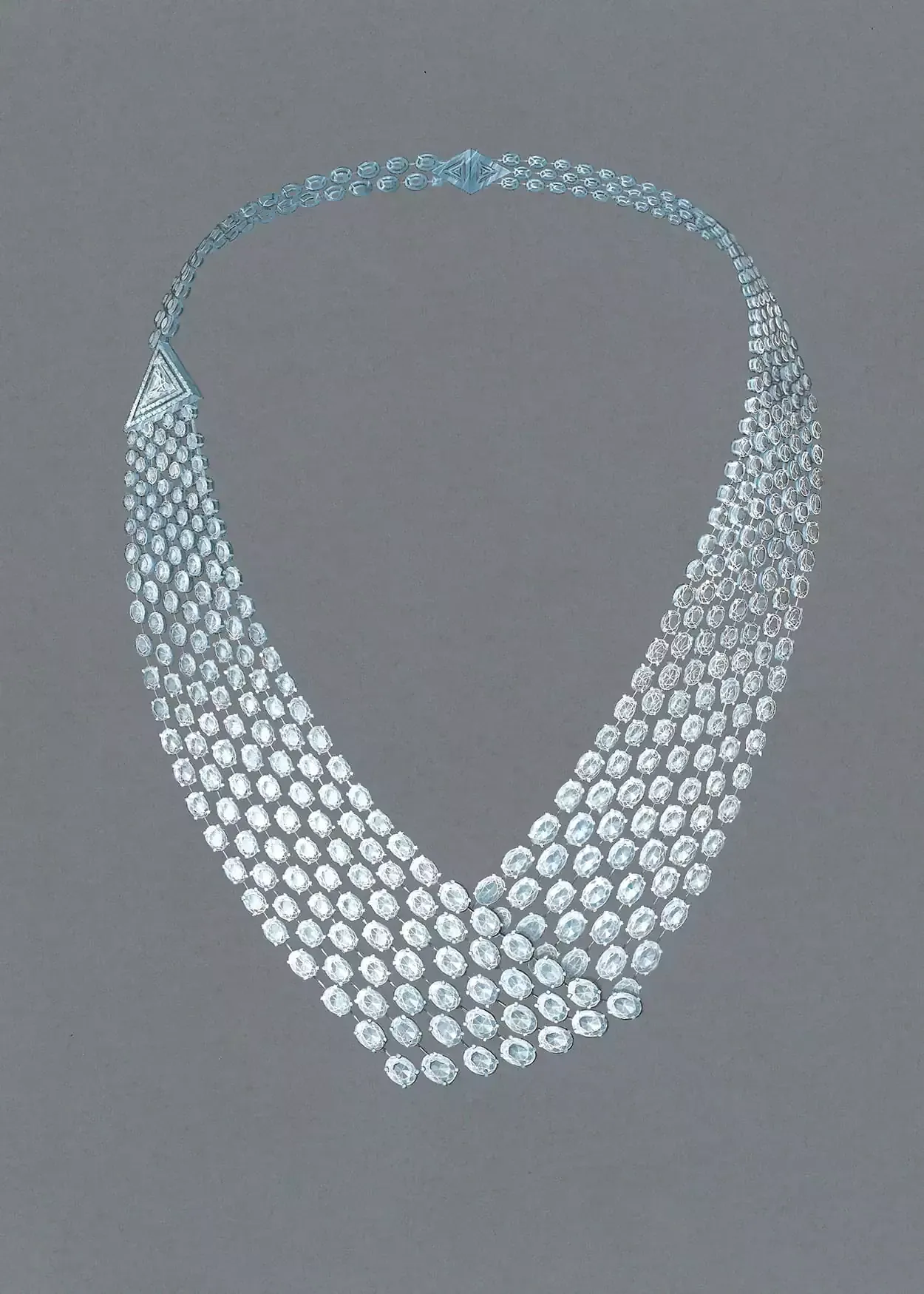 Колье-лента инкрустировано 439 овальными бриллиантами разных размеров и 2 бриллиантами треугольной огранки, общий вес которых составляет 116,6 карата. Струящуюся гибкость этого драгоценного полотна обеспечивает тщательно продуманное переплетение бриллиантов, установленных в шахматном порядке. Конструкцию украшения разработали ювелиры Дома. Создание гармоничной композиции из такого количества разнокалиберных бриллиантов потребовало около 800 часов напряженного труда. По замыслу Валери Мессика, мягкая драпировка из бриллиантов ложится прямо на кожу. С одной стороны ее элегантно удерживает сверкающая брошь в виде бриллианта треугольной огранки. Бесчисленные бриллианты, которыми инкрустированы современные колье, серьги, подвески, серьги-кольца и кольца из коллекции по мотивам "Книги тысячи и одной ночи", напоминают мириады звезд, рассыпанные в ночном небе.
