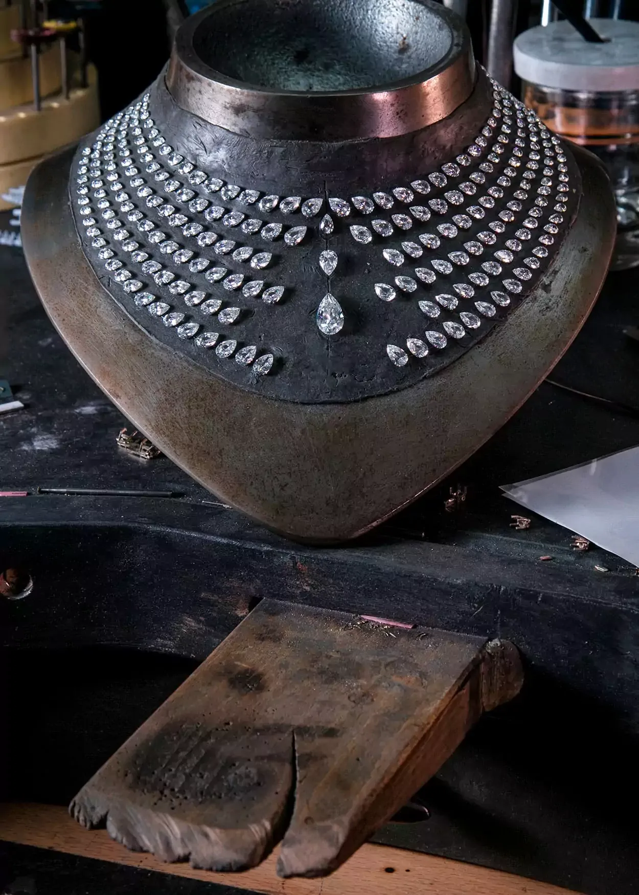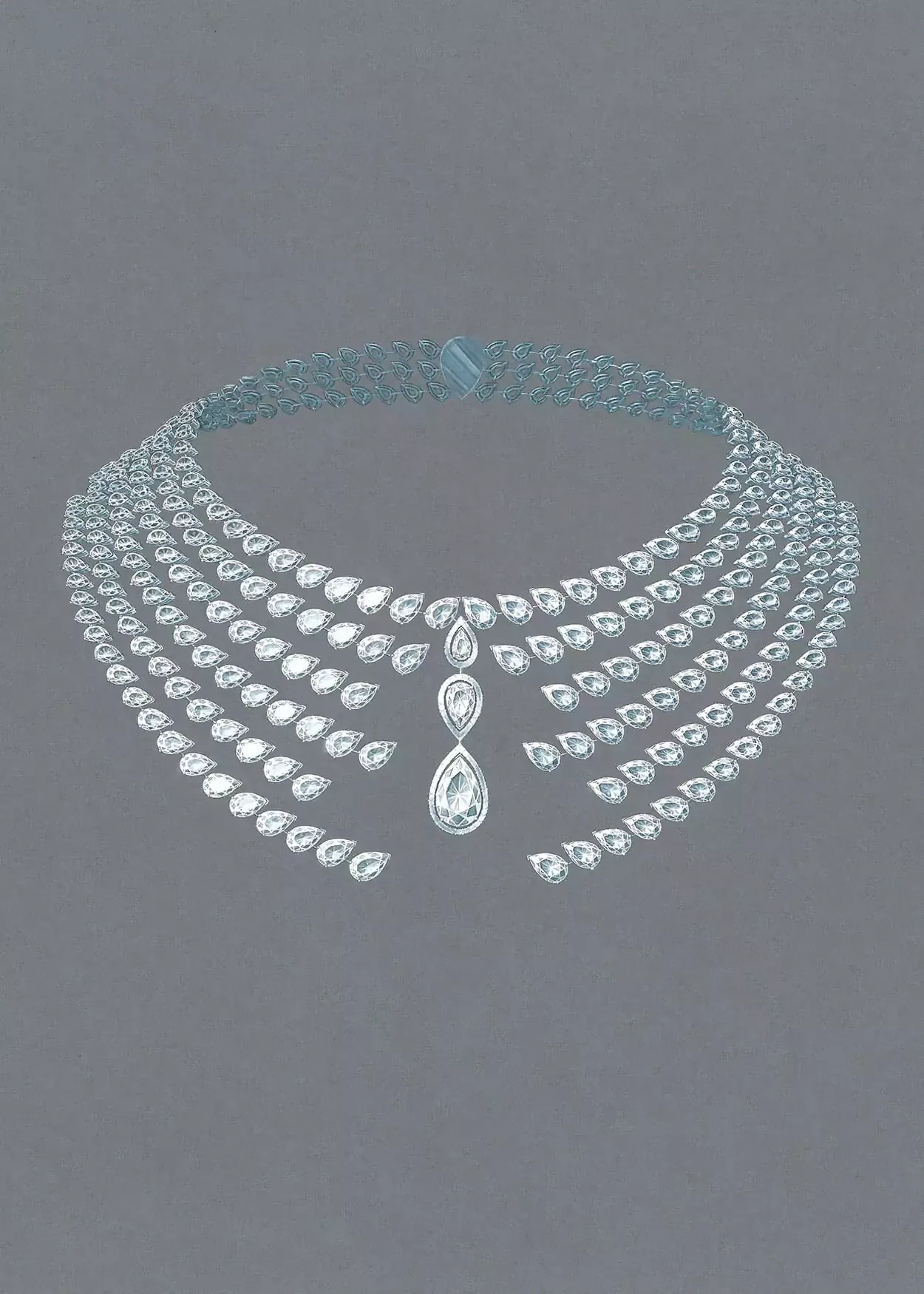 На изготовление этого роскошного колье, отражающего царственную стать Снежной королевы, потребовалось 950 часов кропотливого труда, из которых около 40 часов были потрачены на создание эскиза гуашью. Скульптурное творение, изумляющее своей идеальной симметрией и ослепительным блеском, инкрустировано 341 бриллиантом грушевидной огранки. Драгоценные камни закреплены так, что не соприкасаются друг с другом. В центре эффектно покачиваются три бриллианта, самый крупный из которых весит 3,42 карата. Бриллианты, искусно выложенные в безукоризненно ровные ряды, словно омывают декольте волнами света.
