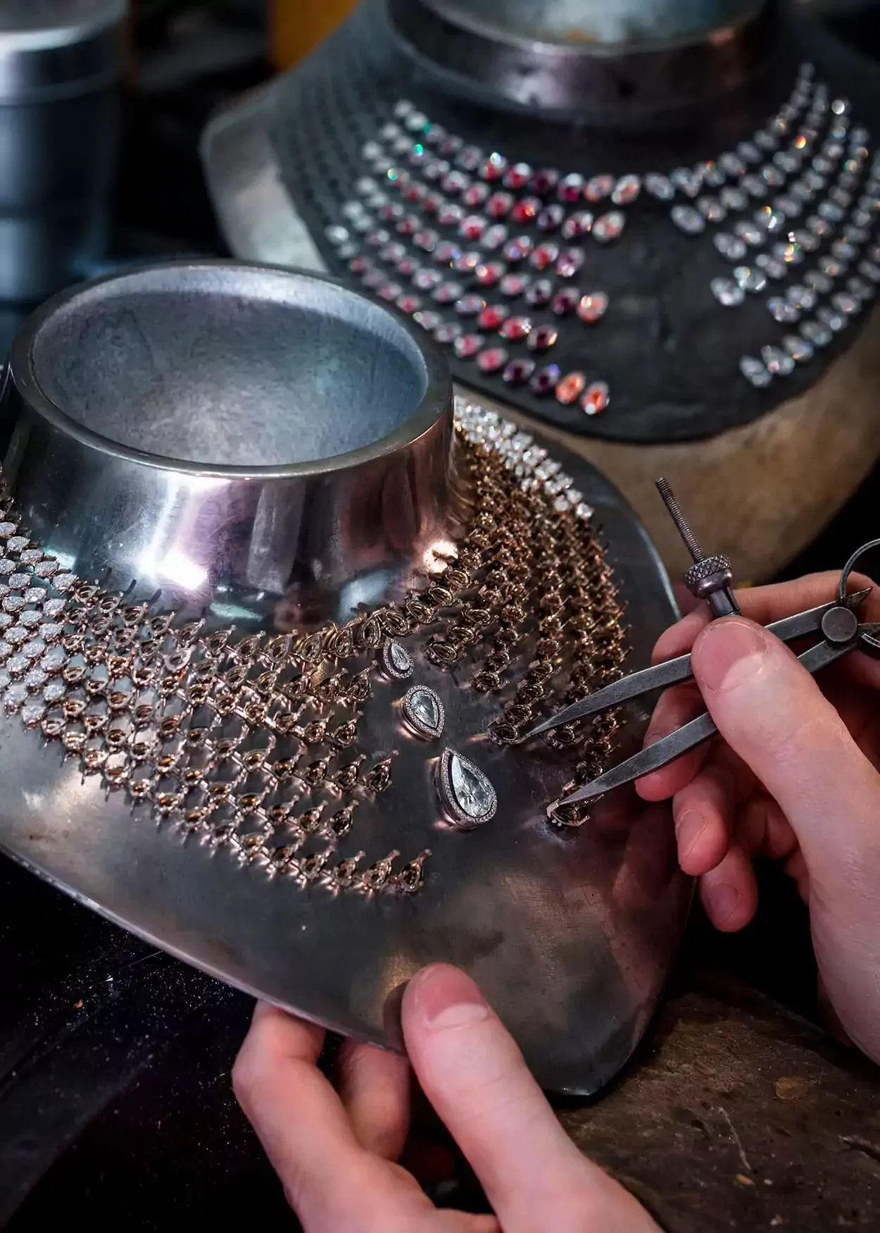 Иногда с помощью ювелирных украшений воображаемое становится реальным. Вот уже три года в конфиденциальной обстановке Atelier Messika, расположившегося под крышей старинного здания в османском стиле, специалисты Messika создают коллекции Высокого ювелирного искусства. Около пятнадцати мастеров — художников, макетчиков, ювелиров, закрепщиков драгоценных камней, полировщиков — усердно трудятся, чтобы воплотить в жизнь творческие идеи Валери Мессика. Здесь, в результате коллективных усилий, на свет появляются поистине уникальные шедевры: колье, чокеры, браслеты, каффы, серьги и кольца. На их изготовление уходят сотни, а порой и тысячи часов напряженного ручного труда. В этом году источником вдохновения для Валери Мессика стали героини волшебных сказок. Их сильный характер, переосмысленный взрослым воображением дизайнера в духе современности, нашел свое воплощение в 22-х украшениях из коллекций The Snow Queen ("Снежная королева"), The Little Mermaid ("Русалочка"), The Arabian Nights ("Арабские ночи"), The Bright Falcon ("Ясный сокол").
