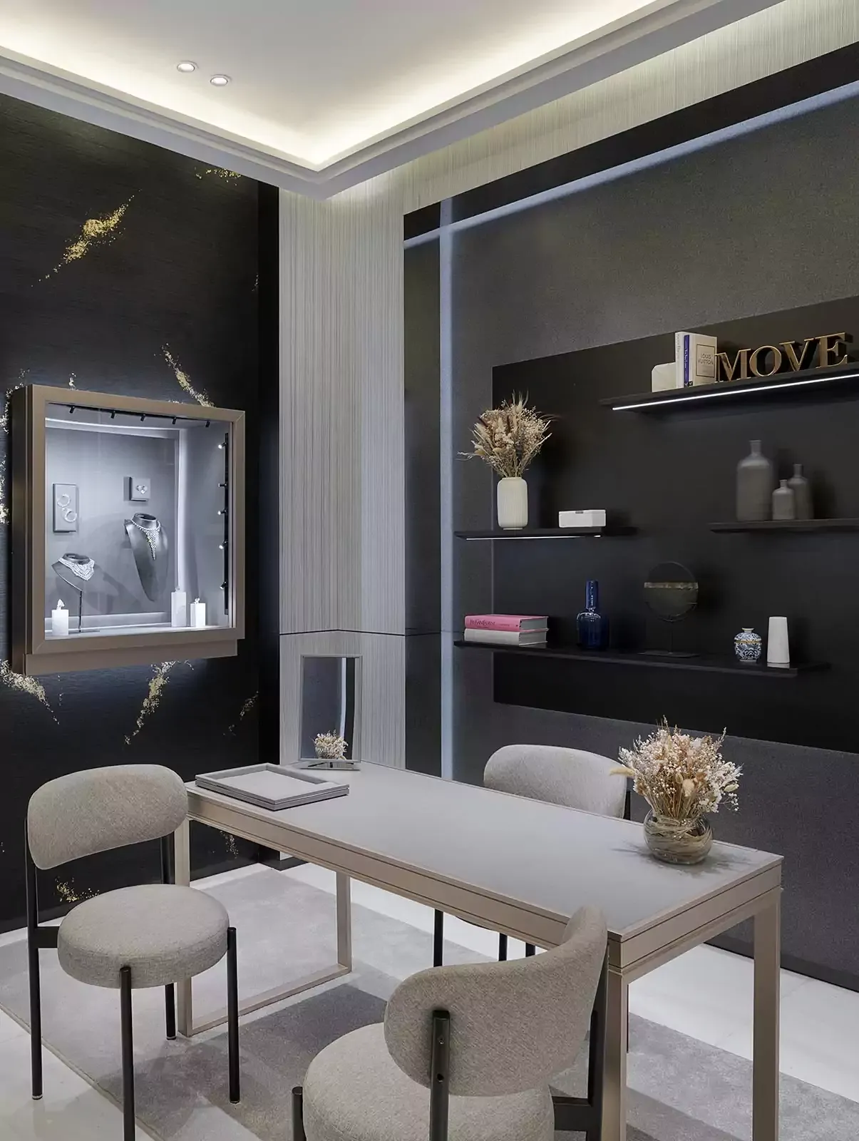 Дизайн этого бутика площадью 70 кв м., разработанного Валери Мессика, отражает ценности Дома, сочетая в себе роскошь и современность с творчеством, чистыми графическими линиями и минимализмом. Серые оттенки и металлические детали цвета розового шампанского, а также мрамор и граненые зеркала: благодаря уникальному сочетанию материалов посетители мгновенно окунаются в мир Messika.