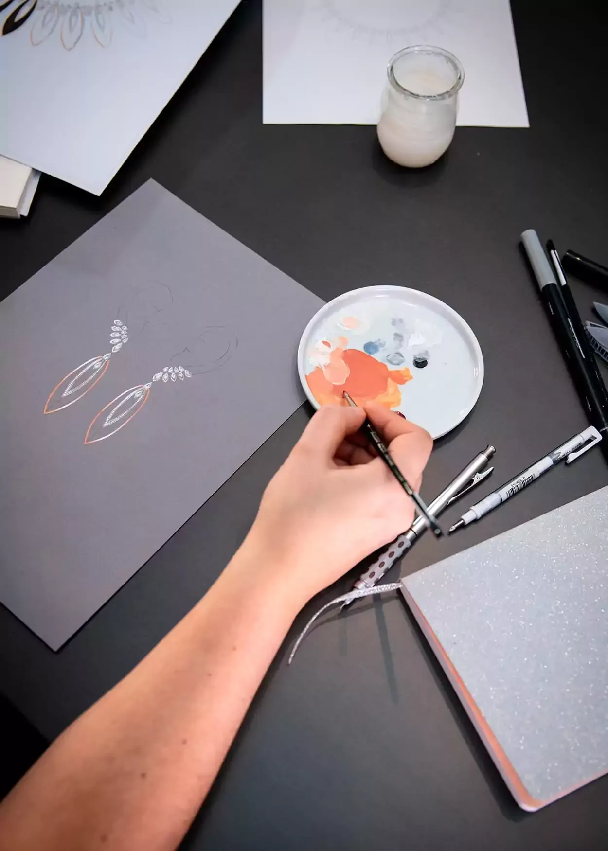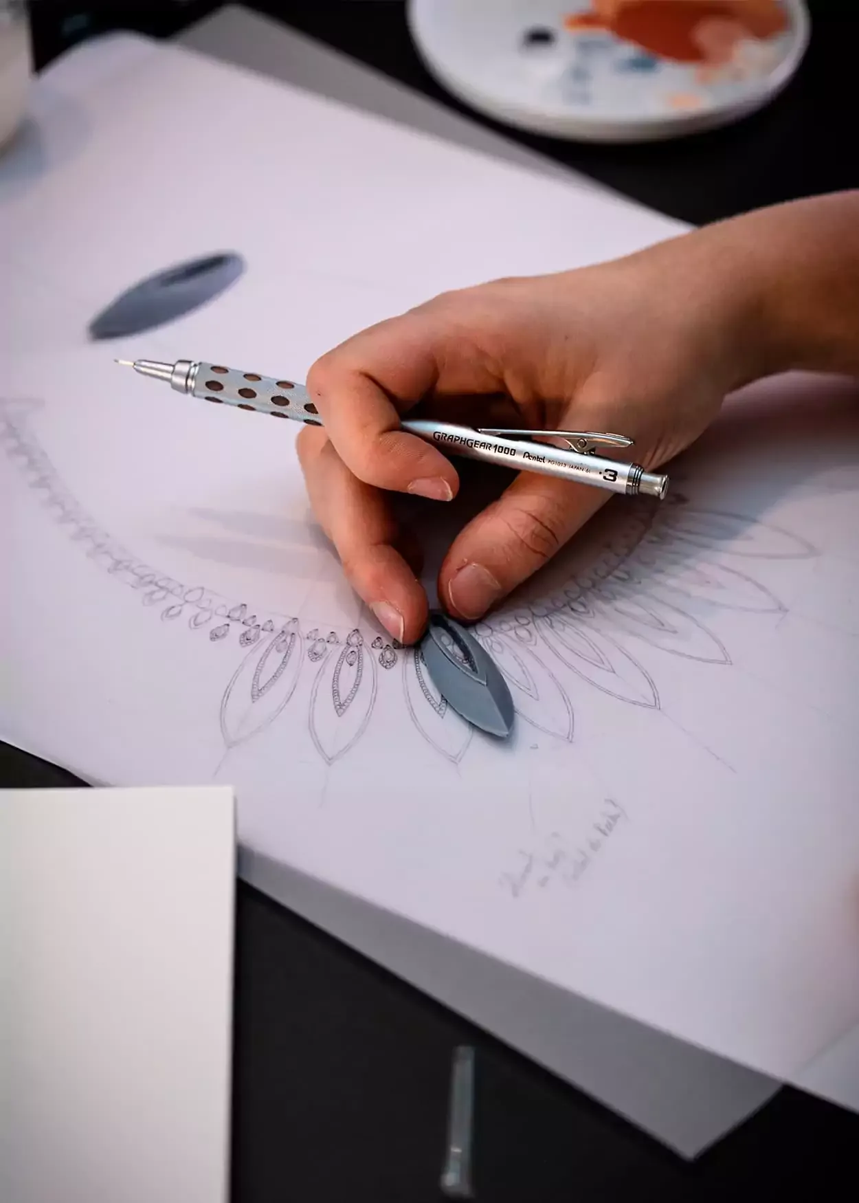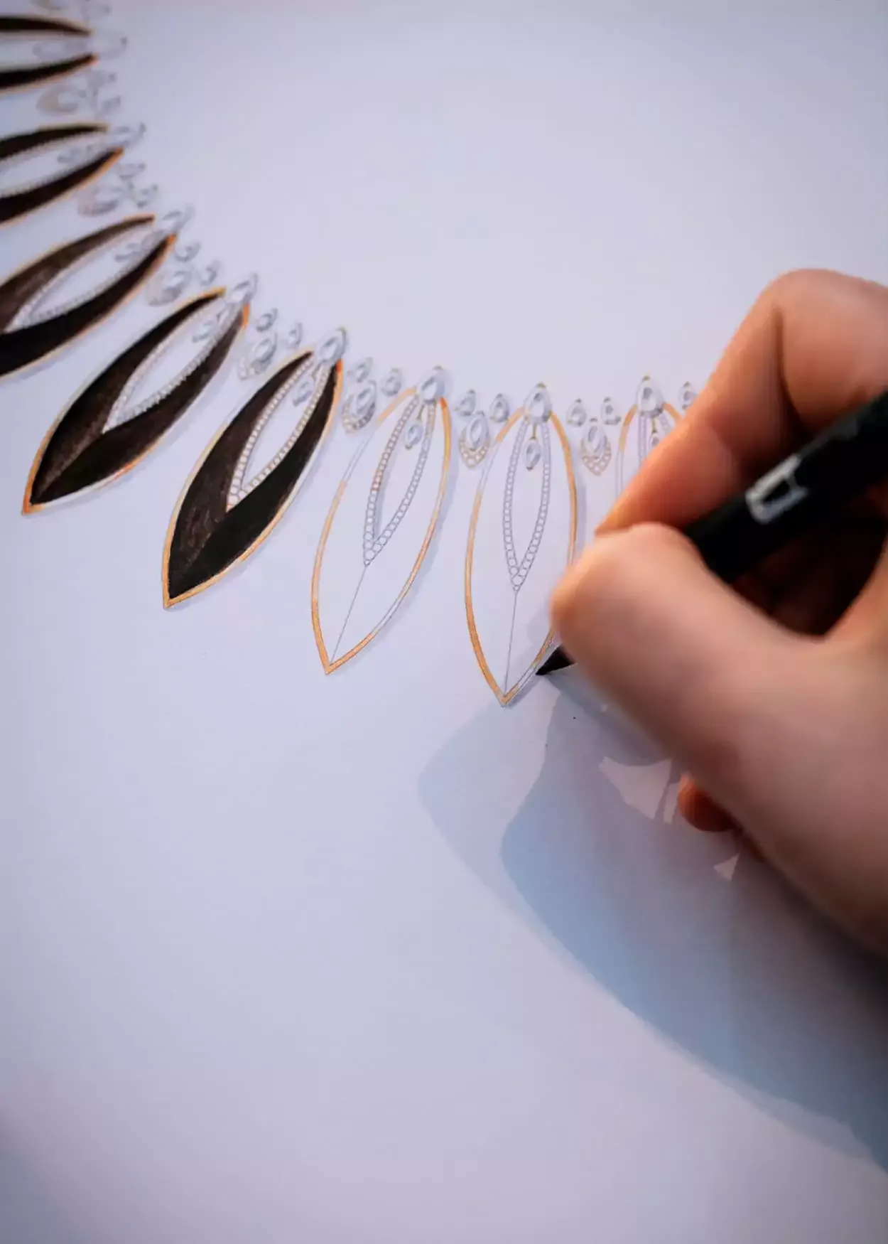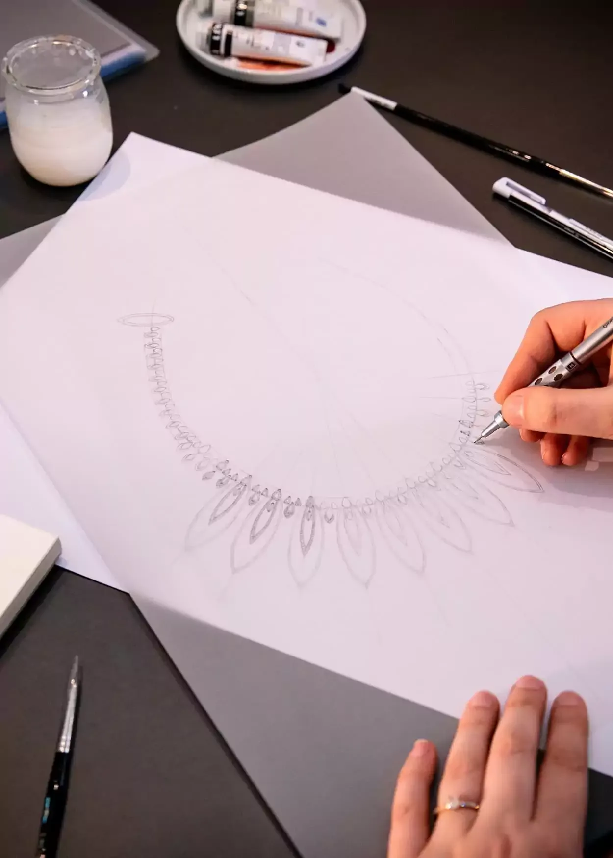 Мы писцы. Наша задача — записывать на бумаге творческие идеи Валери Мессика и Дидье Шерки. Кроме того, получив образование в сфере дизайна украшений, мы с профессиональной точки зрения оцениваем, насколько возможно их воплощение. Когда возникает сомнение, мы обращаемся к ювелирам-технологам и (или)/в производственный отдел. Сначала мы на скорую руку создаем черновые наброски, затем используем предварительно вырезанные заготовки, которые помогают нам выполнить цветное изображение. Затем мы переходим к созданию технического рисунка и окончательного эскиза гуашью. Движение, дизайн композиции, количество камней — все должно быть учтено.