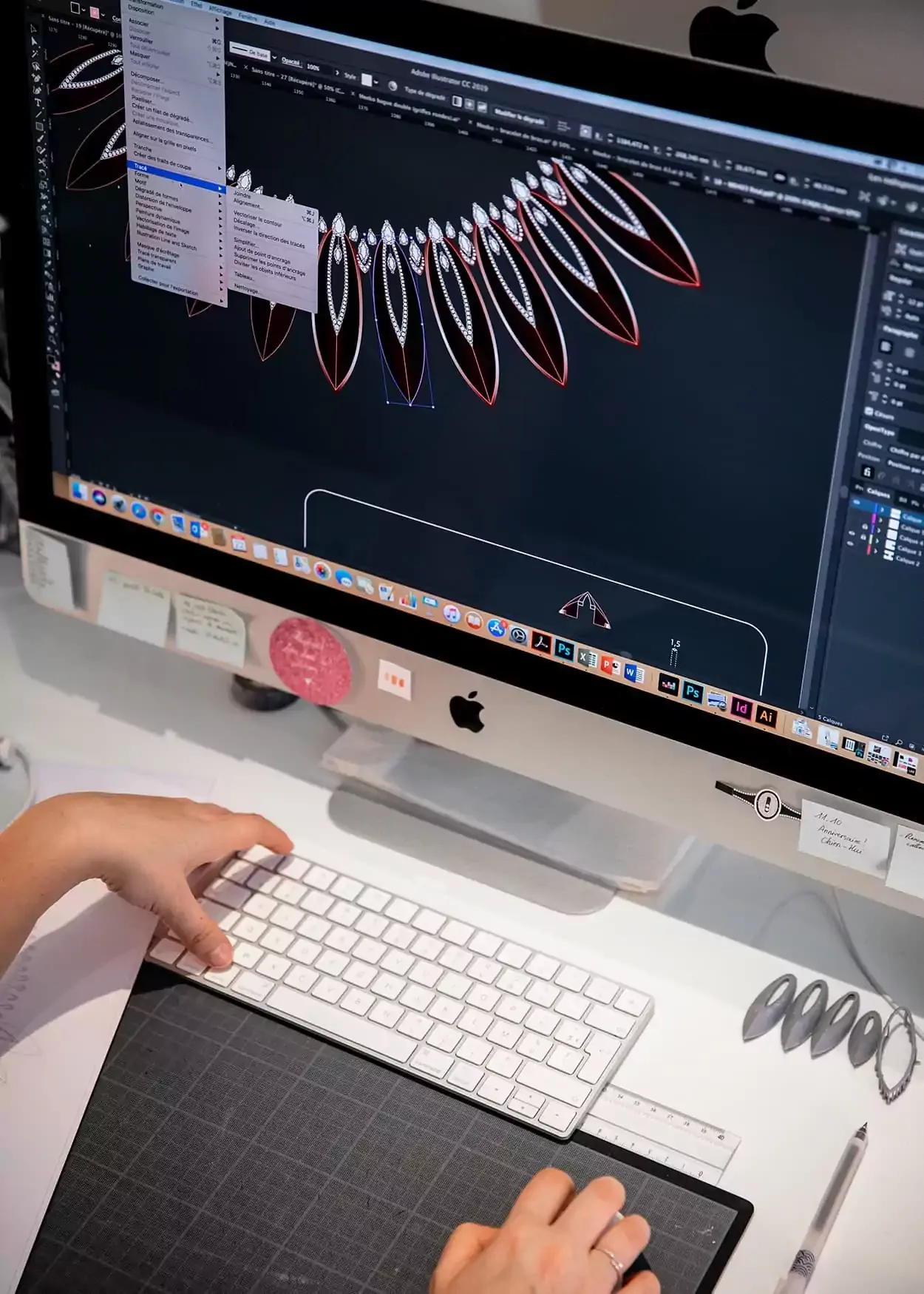 Количество рисунков зависит от сложности украшения. Можно провести два дня над одним и тем же рисунком для колье или набросать тридцать пробных рисунков для серег. Многое также зависит от того, какие изменения необходимо внести. Время выполнения задачи определяет целый ряд параметров: партия камней, предназначенных для украшения, технические ограничения, утвержденный бюджет. Как не бывает одинаковых дней, так и не существует стандартного срока для создания рисунка.