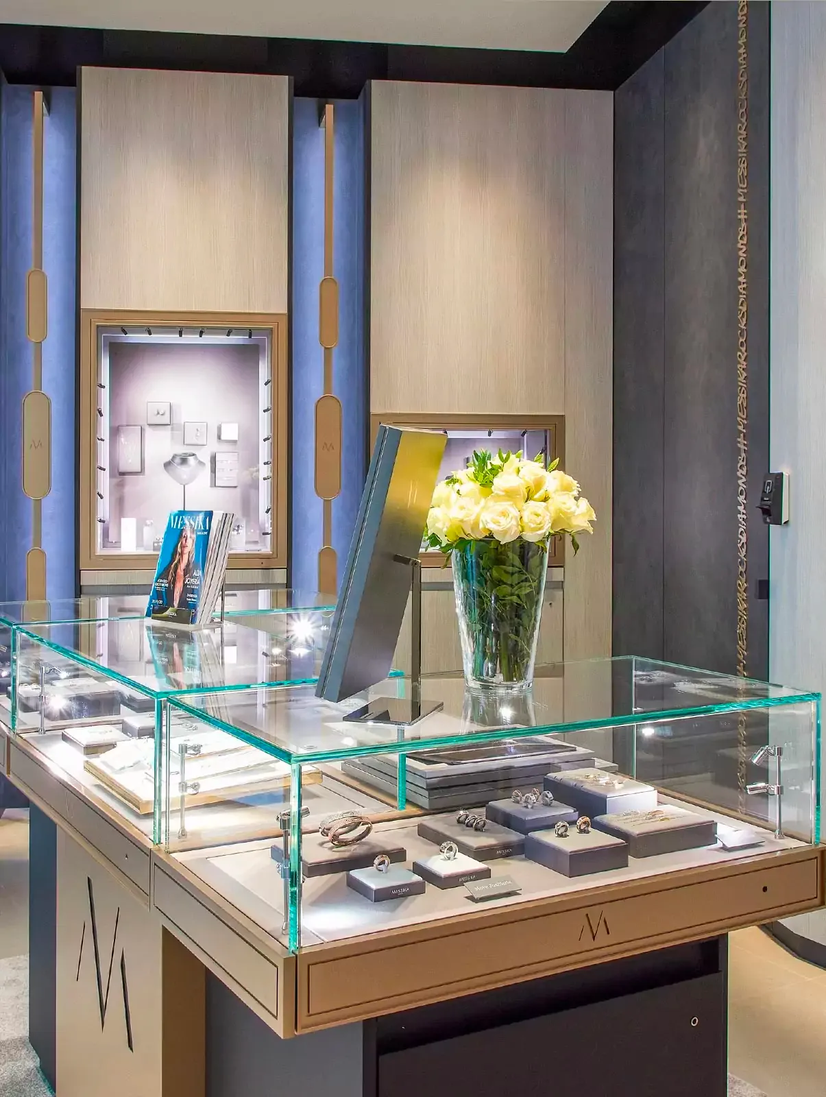 La boutique située sur l’iconique avenue Passeig de Gràcia, a été réalisée par Sophie Reulet, chef du studio créatif Messika avec l’œil avisée de Valérie Messika. Dès son entrée dans le magasin, le client est immédiatement plongé dans un environnement portant les valeurs de la Maison de Joaillerie et Haute Joaillerie Messika.
