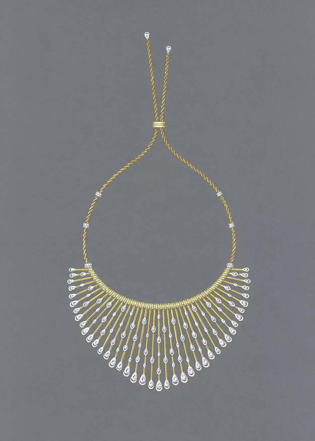 With excellence for leitmotiv, this diamond piece is based on flexibility : each layer is articulated and threaded onto a corded chain which is placed directly around the neck. This sensation is reinforced by the high level of technicity of the feather setting which also take part of this high jewelry diamond creation.